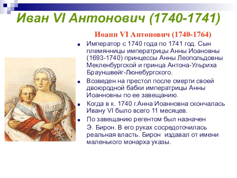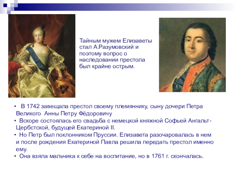 В 1742 завещала престол своему племяннику, сыну дочери Петра Великого Анны Петру Фёдоровичу