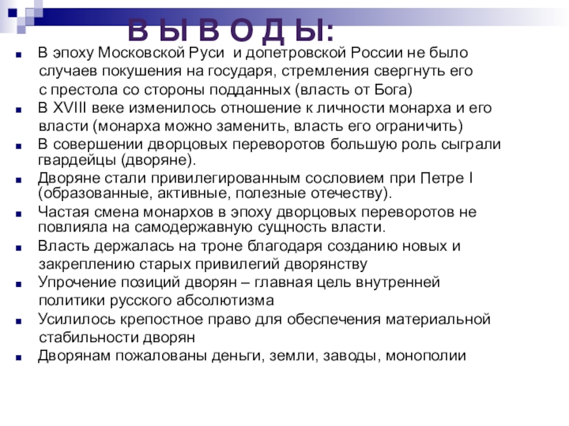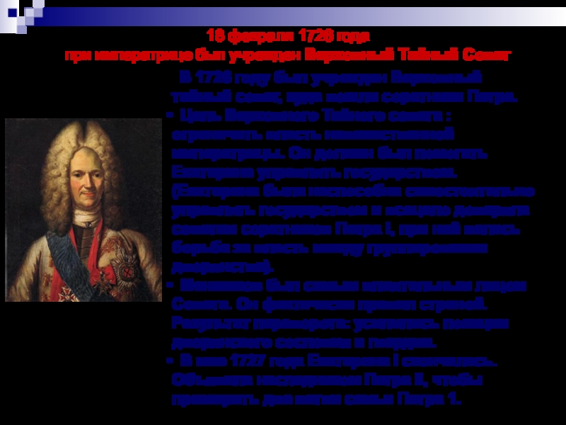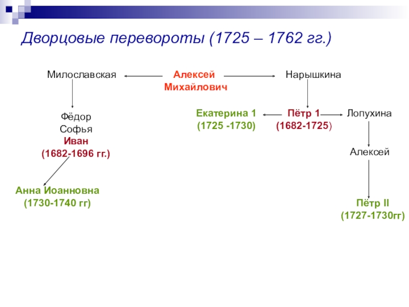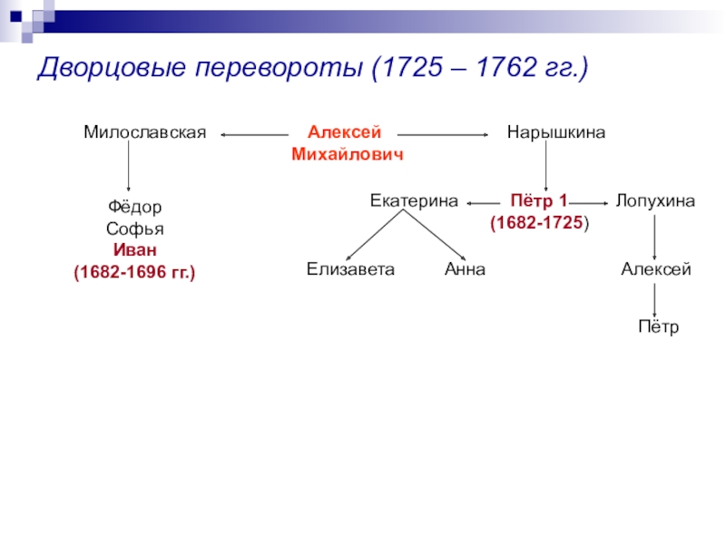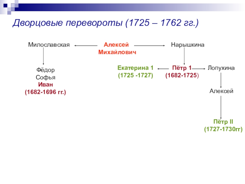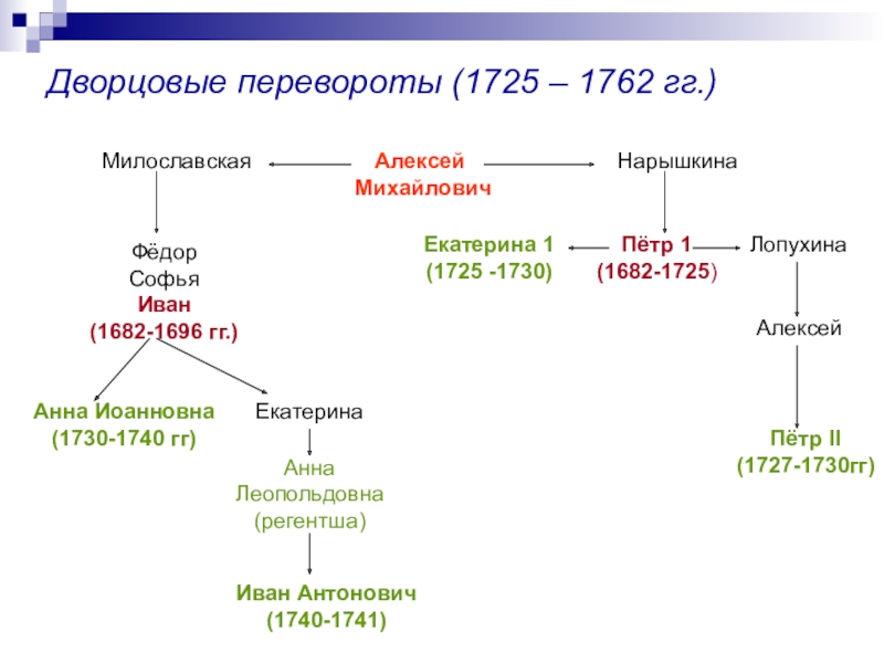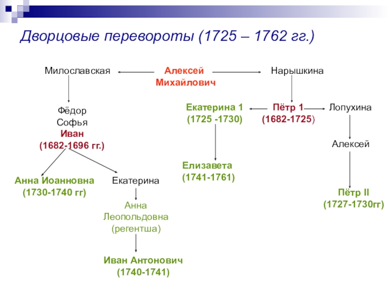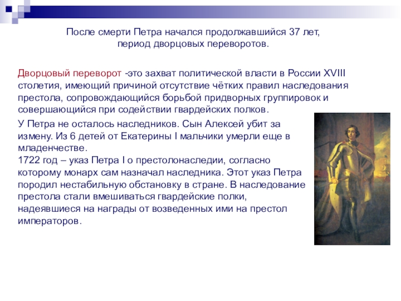 1722 год – указ Петра I о престолонаследии, согласно которому монарх сам назначал наследника. Этот указ Петра породил нестабильную обстановку в стране. В наследование престола стали вмешиваться гвардейские полки, надеявшиеся на награды от возведенных ими на престол императоров.