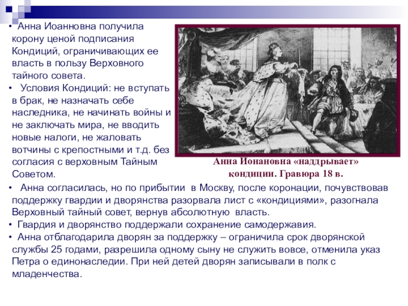 Анна согласилась, но по прибытии в Москву, после коронации, почувствовав поддержку гвардии и дворянства разорвала лист с «кондициями», разогнала Верховный тайный совет, вернув абсолютную власть.
