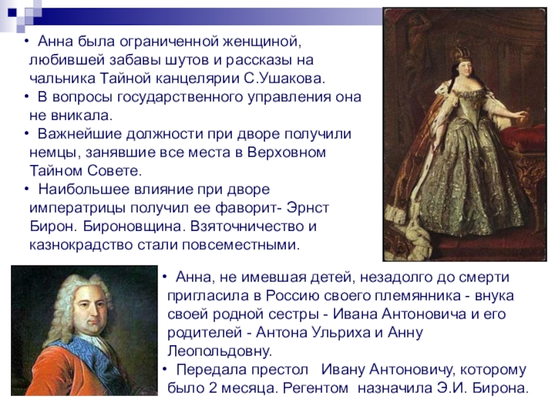 Анна была ограниченной женщиной, любившей забавы шутов и рассказы на чальника Тайной канцелярии С.Ушакова.