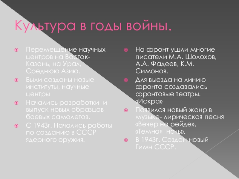 На фронт ушли многие писатели М.А. Шолохов, А.А. Фадеев, К.М. Симонов.