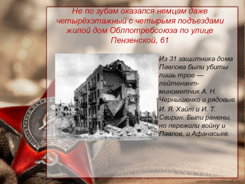 Из 31 защитника дома Павлова были убиты лишь трое — лейтенант-минометчик А. Н. Чернышенко и рядовые