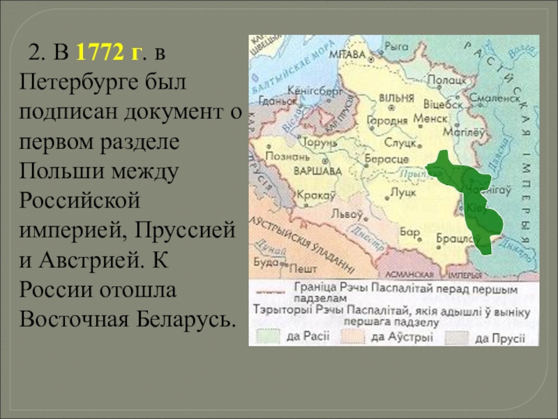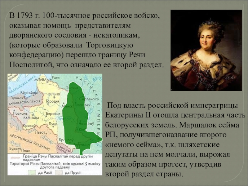 Под власть российской императрицы Екатерины II отошла центральная часть белорусских земель. Маршалок сейма РП, получившегоназвание второго «немого сейма», т.к. шляхетские депутаты на нем молчали, вырожая таким образом протест, утвердив второй раздел страны.