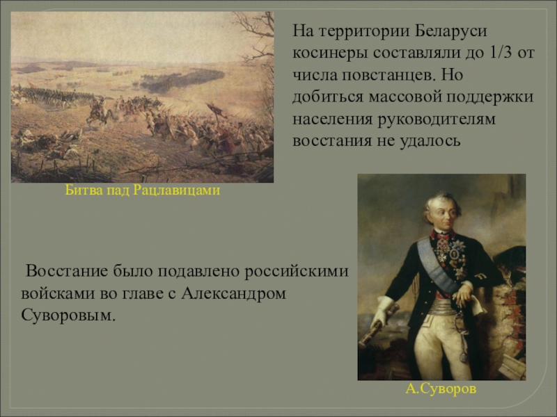 В изданном им "Свирских универсале" Костюшко обещал отменить личную зависимость крестьян, принявших участие в восстании. В отряды повстанцев потянулись косинеры - крестьяне, вооруженные косами.