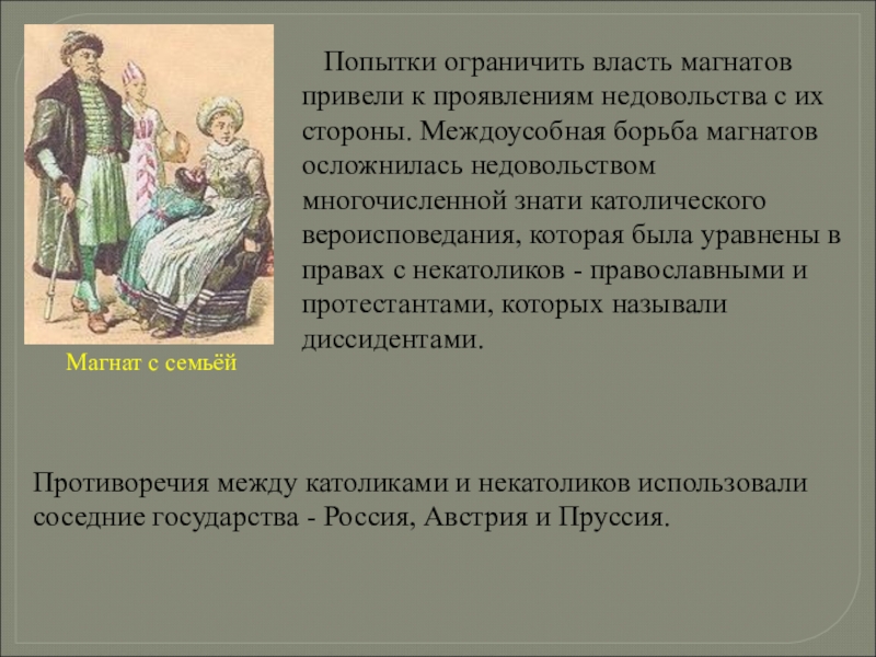 Попытки ограничить власть магнатов привели к проявлениям недовольства с их стороны. Междоусобная борьба магнатов осложнилась недовольством многочисленной знати католического вероисповедания, которая была уравнены в правах с некатоликов - православными и протестантами, которых называли диссидентами.