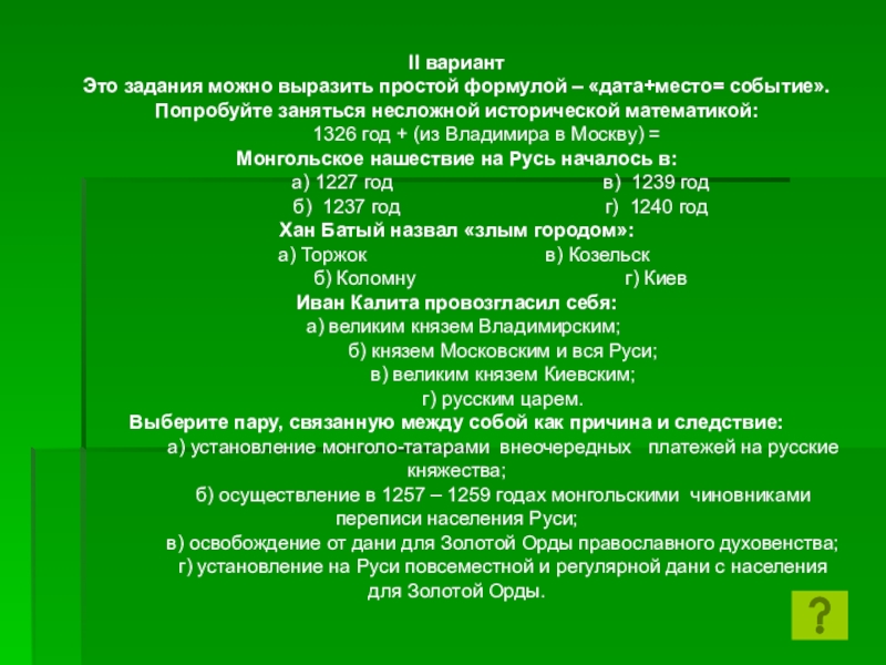 Это задания можно выразить простой формулой – «дата+место= событие». Попробуйте