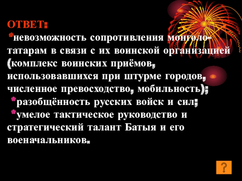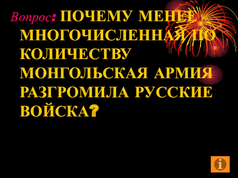 Слайд 6Вопрос: ПОЧЕМУ МЕНЕЕ МНОГОЧИСЛЕННАЯ ПО КОЛИЧЕСТВУ МОНГОЛЬСКАЯ АРМИЯ РАЗГРОМИЛА РУССКИЕ ВОЙСКА?