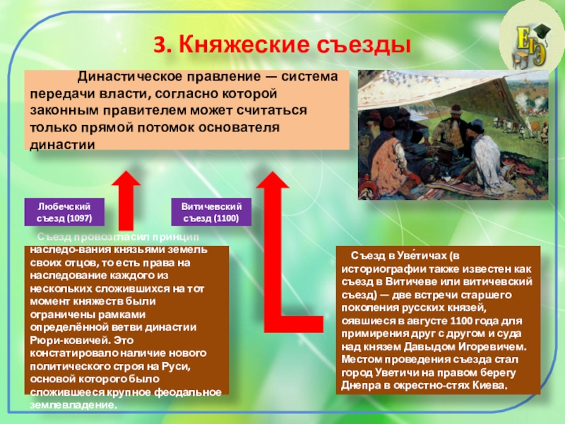 Съезд провозгласил принцип наследо-вания князьями земель своих отцов, то есть права на наследование каждого из нескольких сложившихся на тот момент княжеств были ограничены рамками определённой ветви династии Рюри-ковичей. Это констатировало наличие нового политического строя на Руси, основой которого было сложившееся крупное феодальное землевладение.