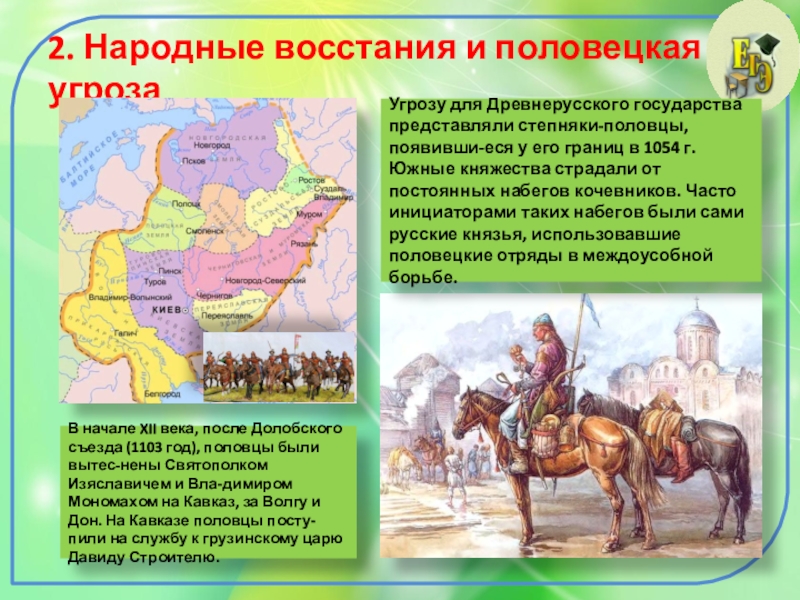Угрозу для Древнерусского государства представляли степняки-половцы, появивши-еся у его границ в 1054 г. Южные княжества страдали от постоянных набегов кочевников. Часто инициаторами таких набегов были сами русские князья, использовавшие половецкие отряды в междоусобной борьбе.