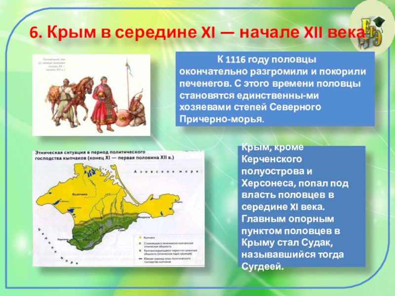 Крым, кроме Керченского полуострова и Херсонеса, попал под власть половцев в середине XI века. Главным опорным пунктом половцев в Крыму стал Судак, называвшийся тогда Сугдеей.