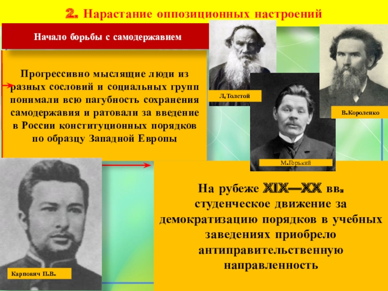 На рубеже XIX—XX вв. студенческое движение за демократизацию порядков в учебных заведениях приобрело антиправительственную направленность