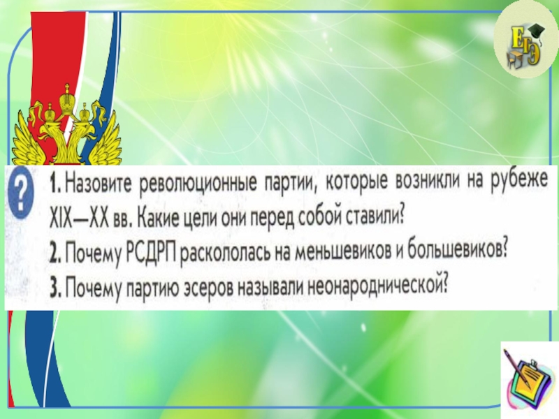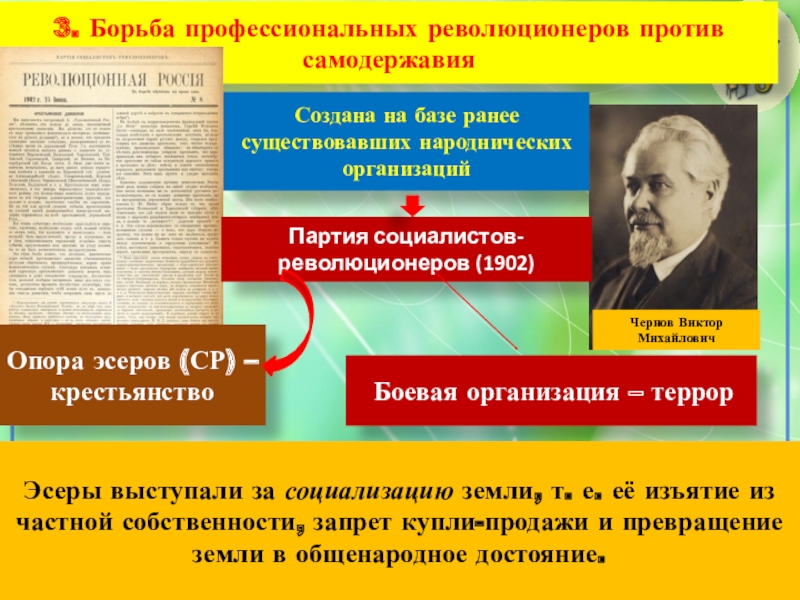 Эсеры выступали за социализацию земли, т. е. её изъятие из частной собственности, запрет купли-продажи и превращение земли в общенародное достояние.