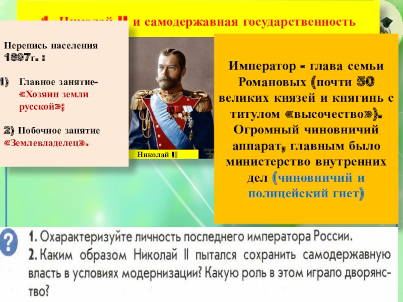 Император - глава семьи Романовых (почти 50 великих князей и княгинь с титулом «высочество»).