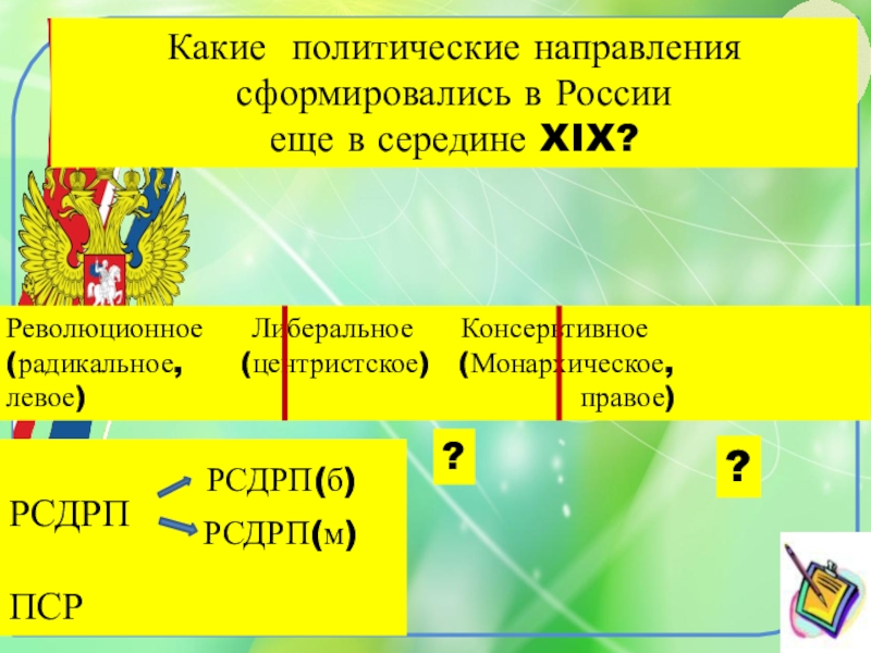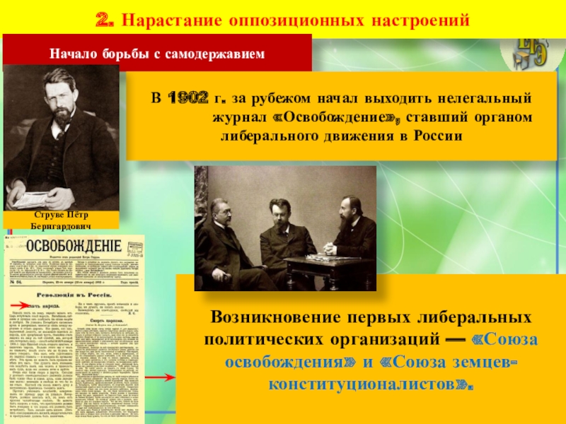 Возникновение первых либеральных политических организаций — «Союза освобождения» и «Союза земцев-конституционалистов».