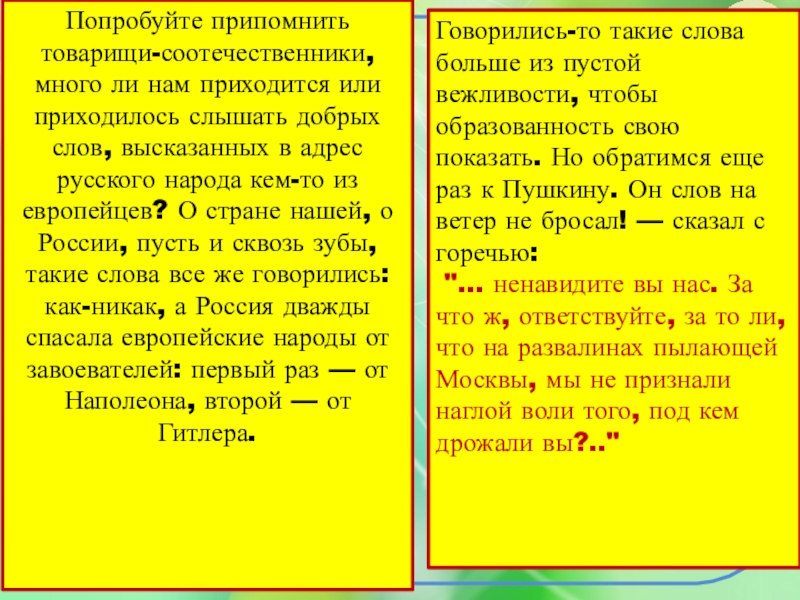 "… ненавидите вы нас. За что ж, ответствуйте, за то ли, что на развалинах пылающей Москвы, мы не признали наглой воли того, под кем дрожали вы?.."