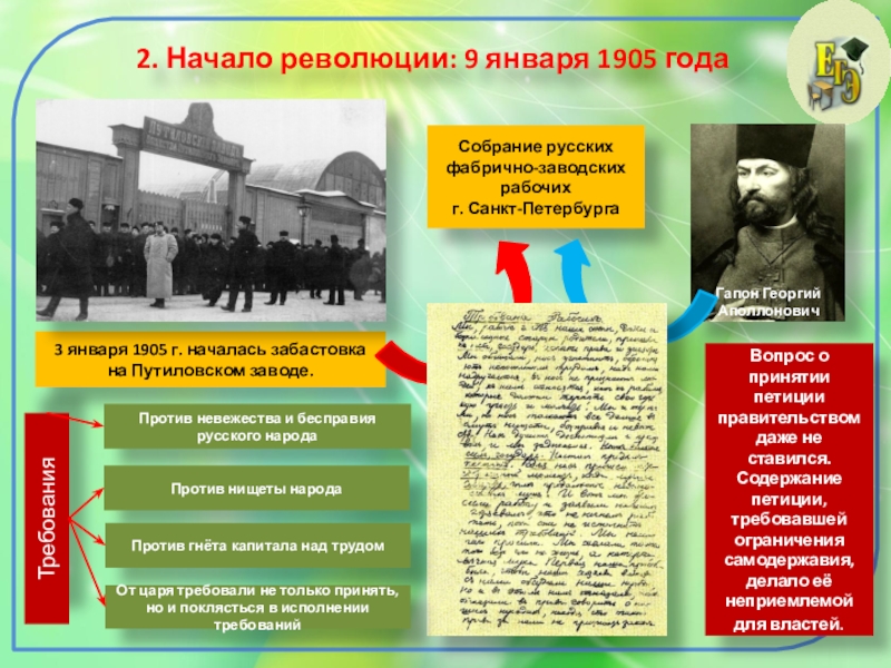 «Вот, государь, наши главные нужды, с которыми мы пришли к тебе… Повели и поклянись исполнить их, и ты сделаешь Россию и счастливой и славной, а имя твоё запечатлеешь в сердцах наших и наших потомков на вечные времена. А не повелишь, не отзовёшься на нашу мольбу, — мы умрём здесь, на этой площади, перед твоим дворцом. Нам некуда больше идти и незачем. У нас только два пути: или к свободе и счастью, или в могилу… Пусть наша жизнь будет жертвой для исстрадавшейся России. Нам не жаль этой жертвы, мы охотно приносим её!»