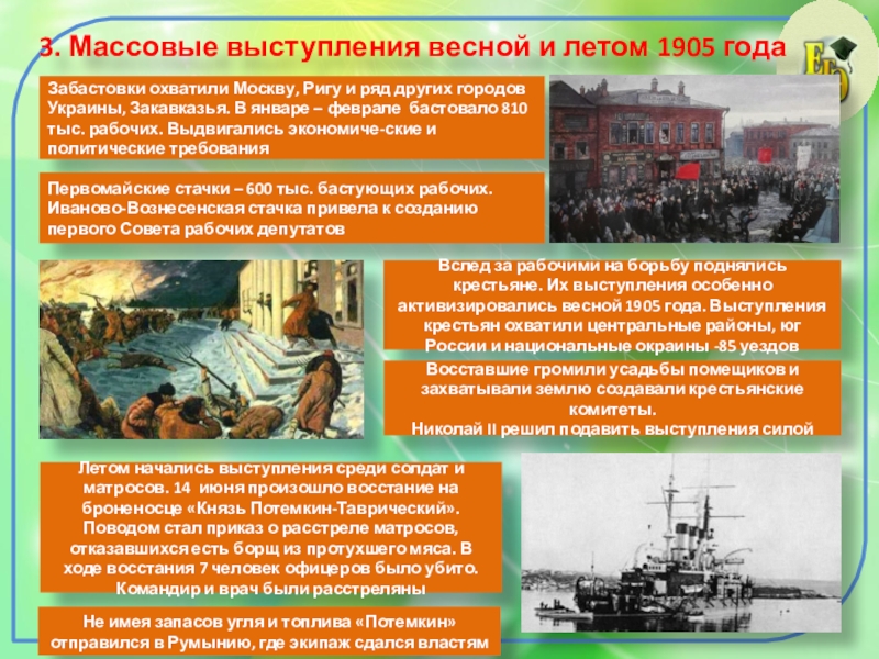 Первомайские стачки – 600 тыс. бастующих рабочих. Иваново-Вознесенская стачка привела к созданию первого Совета рабочих депутатов