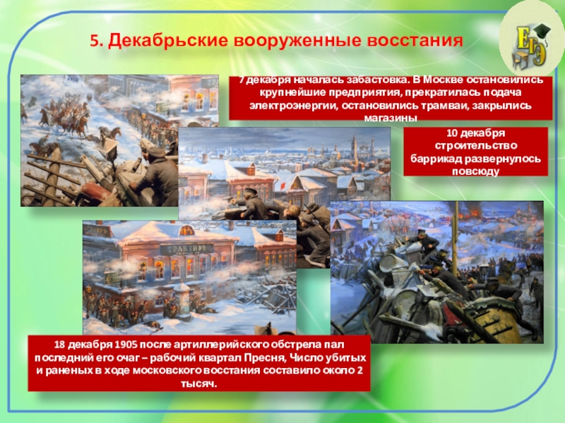 18 декабря 1905 после артиллерийского обстрела пал последний его очаг – рабочий квартал Пресня, Число убитых и раненых в ходе московского восстания составило около 2 тысяч.