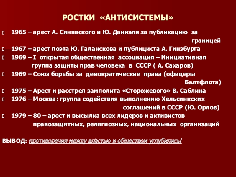 РОСТКИ «АНТИСИСТЕМЫ»1965 – арест А. Синявского и Ю. Даниэля за публикацию за