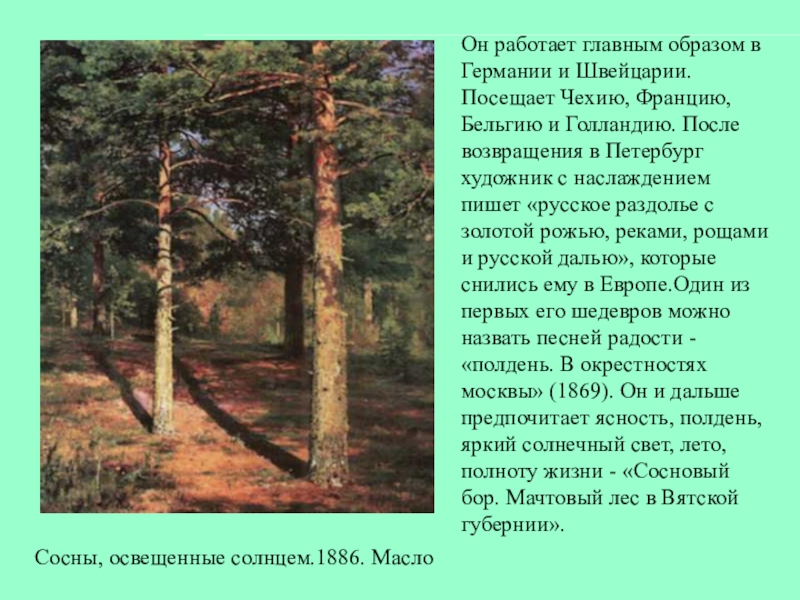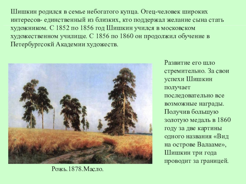 Развитие его шло стремительно. За свои успехи Шишкин получает последовательно все возможные награды. Получив большую золотую медаль в 1860 году за две картины одного названия «Вид на острове Валааме», Шишкин три года проводит за границей.