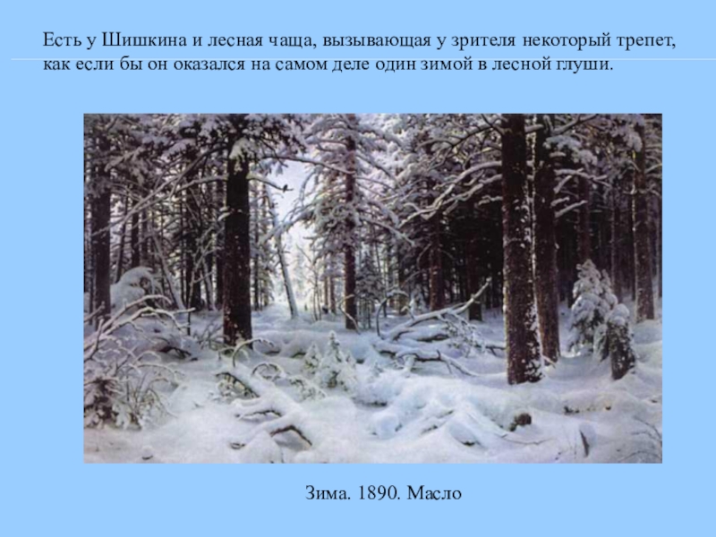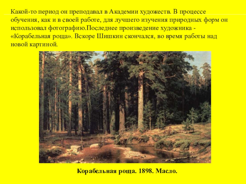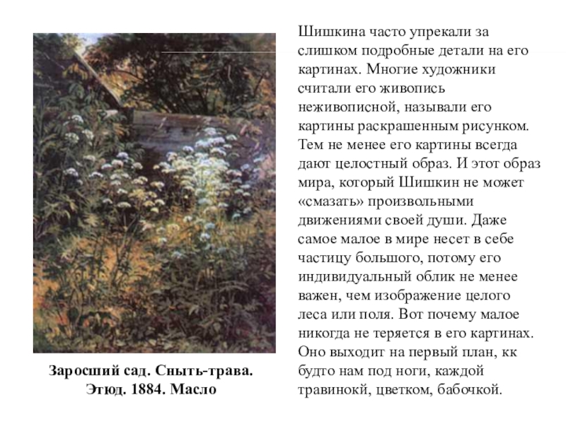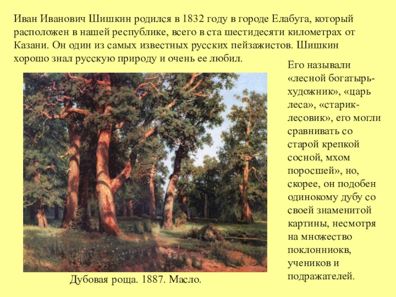 Его называли «лесной богатырь-художник», «царь леса», «старик-лесовик», его могли сравнивать со старой крепкой сосной, мхом поросшей», но, скорее, он подобен одинокому дубу со своей знаменитой картины, несмотря на множество поклонниокв, учеников и подражателей.