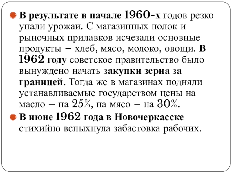 полок и рыночных прилавков исчезали основные продукты – хлеб, мясо, молоко, овощи. В 1962 году советское правительство было вынуждено начать закупки зерна за границей. Тогда же в магазинах подняли устанавливаемые государством цены на масло – на 25%, на мясо – на 30%.