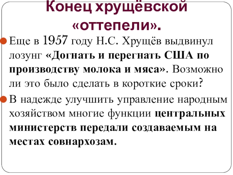 Еще в 1957 году Н.С. Хрущёв выдвинул лозунг «Догнать