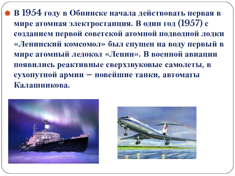 электростанция. В один год (1957) с созданием первой советской атомной подводной лодки «Ленинский комсомол» был спущен на воду первый в мире атомный ледокол «Ленин». В военной авиации появились реактивные сверхзвуковые самолеты, в сухопутной армии – новейшие танки, автоматы Калашникова.