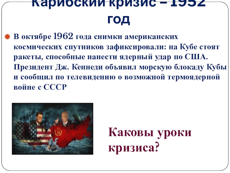 спутников зафиксировали: на Кубе стоят ракеты, способные нанести ядерный удар по США. Президент Дж. Кеннеди объявил морскую блокаду Кубы и сообщил по телевидению о возможной термоядерной войне с СССР