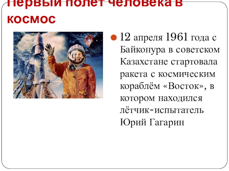 советском Казахстане стартовала ракета с космическим кораблём «Восток», в котором находился лётчик-испытатель Юрий Гагарин