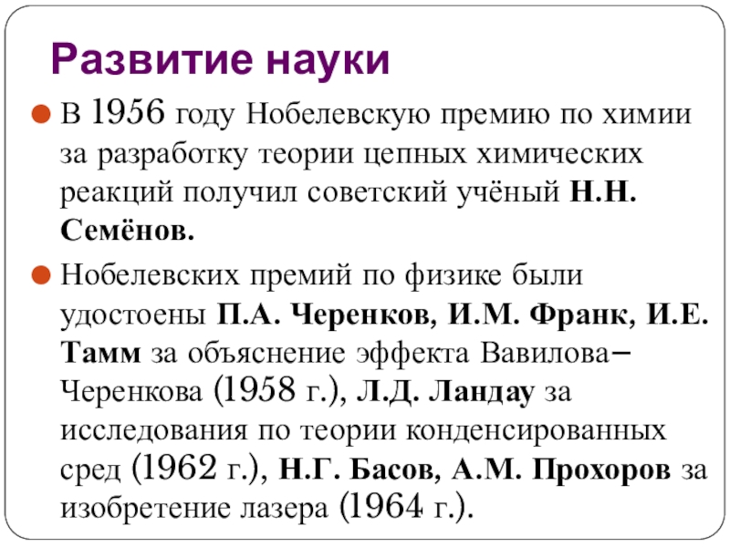 Нобелевских премий по физике были удостоены П.А. Черенков, И.М. Франк, И.Е. Тамм за объяснение эффекта Вавилова–Черенкова (1958 г.), Л.Д. Ландау за исследования по теории конденсированных сред (1962 г.), Н.Г. Басов, А.М. Прохоров за изобретение лазера (1964 г.).
