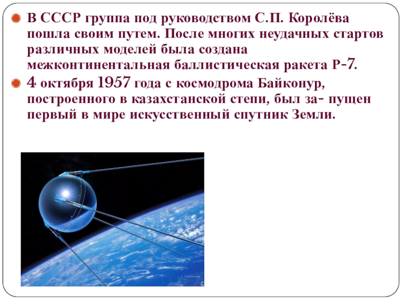 Слайд 7В СССР группа под руководством С.П. Королёва пошла своим путем. После