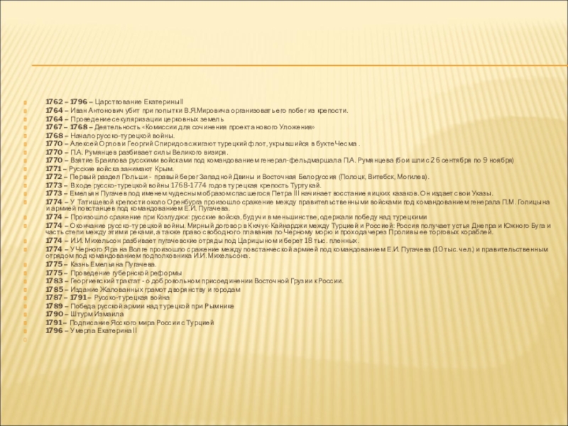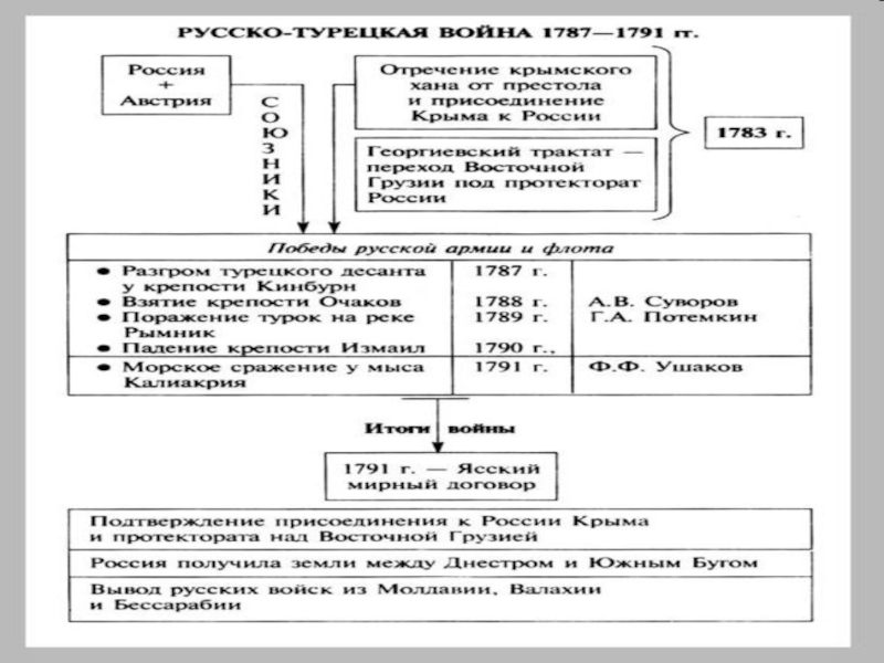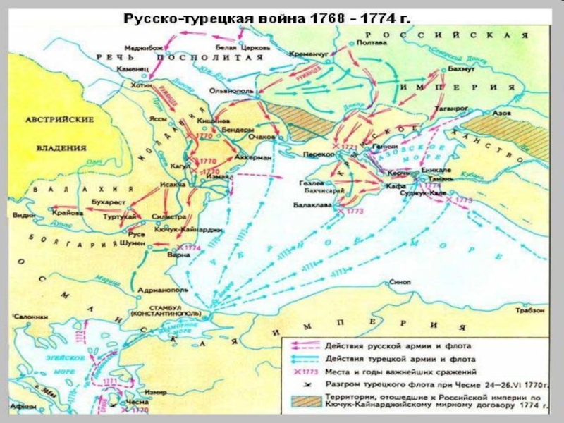 1774 – Окончание русско-турецкой войны. Мирный договор в Кючук-Кайнарджи между Турцией и Россией: Россия получает устья Днепра и Южного Буга и часть степи между этими реками, а также право свободного плавания по Черному морю и прохода через Проливы ее торговых кораблей.