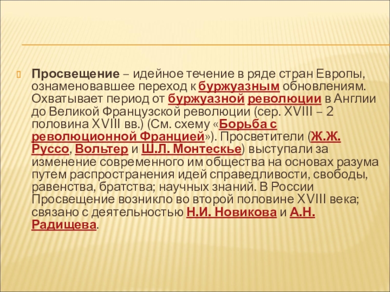 буржуазным обновлениям. Охватывает период от буржуазной революции в Англии до Великой Французской революции (сер. XVIII – 2 половина XVIII вв.) (См. схему «Борьба с революционной Францией»). Просветители (Ж.Ж. Руссо, Вольтер и Ш.Л. Монтескье) выступали за изменение современного им общества на основах разума путем распространения идей справедливости, свободы, равенства, братства; научных знаний. В России Просвещение возникло во второй половине XVIII века; связано с деятельностью Н.И. Новикова и А.Н. Радищева.