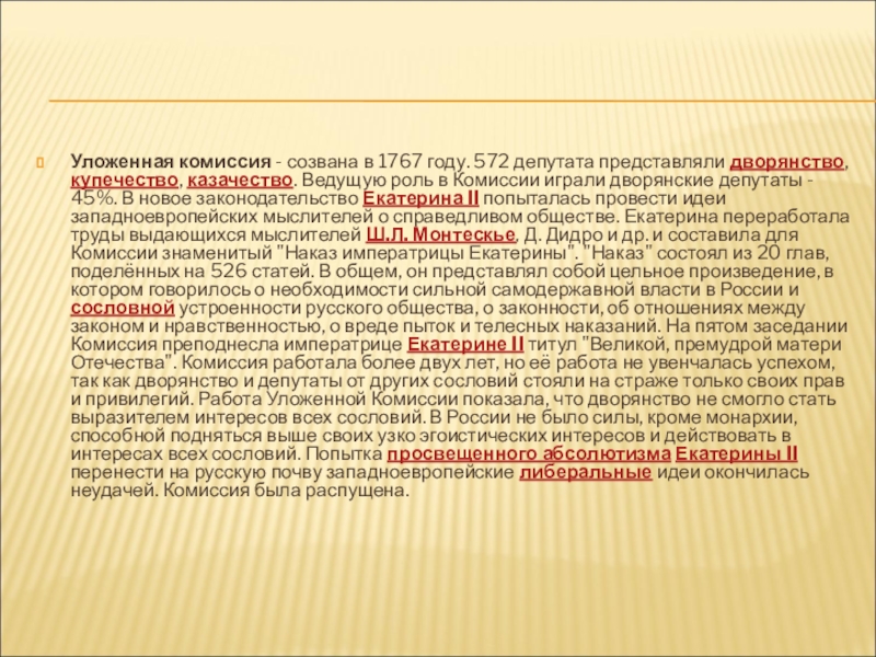 купечество, казачество. Ведущую роль в Комиссии играли дворянские депутаты - 45%. В новое законодательство Екатерина II попыталась провести идеи западноевропейских мыслителей о справедливом обществе. Екатерина переработала труды выдающихся мыслителей Ш.Л. Монтескье, Д. Дидро и др. и составила для Комиссии знаменитый "Наказ императрицы Екатерины". "Наказ" состоял из 20 глав, поделённых на 526 статей. В общем, он представлял собой цельное произведение, в котором говорилось о необходимости сильной самодержавной власти в России и сословной устроенности русского общества, о законности, об отношениях между законом и нравственностью, о вреде пыток и телесных наказаний. На пятом заседании Комиссия преподнесла императрице Екатерине II титул "Великой, премудрой матери Отечества". Комиссия работала более двух лет, но её работа не увенчалась успехом, так как дворянство и депутаты от других сословий стояли на страже только своих прав и привилегий. Работа Уложенной Комиссии показала, что дворянство не смогло стать выразителем интересов всех сословий. В России не было силы, кроме монархии, способной подняться выше своих узко эгоистических интересов и действовать в интересах всех сословий. Попытка просвещенного абсолютизма Екатерины II перенести на русскую почву западноевропейские либеральные идеи окончилась неудачей. Комиссия была распущена.