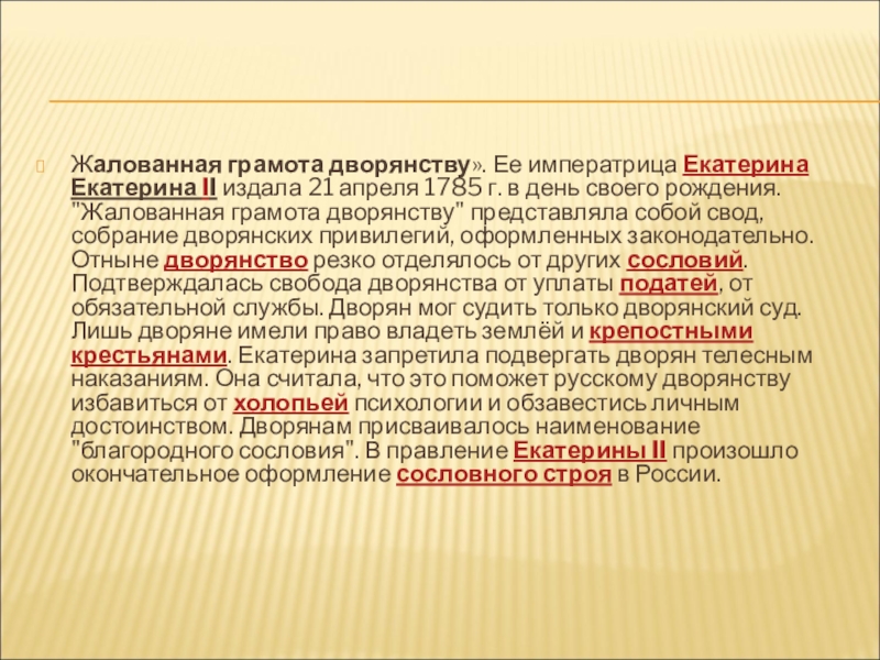 1785 г. в день своего рождения. "Жалованная грамота дворянству" представляла собой свод, собрание дворянских привилегий, оформленных законодательно. Отныне дворянство резко отделялось от других сословий. Подтверждалась свобода дворянства от уплаты податей, от обязательной службы. Дворян мог судить только дворянский суд. Лишь дворяне имели право владеть землёй и крепостными крестьянами. Екатерина запретила подвергать дворян телесным наказаниям. Она считала, что это поможет русскому дворянству избавиться от холопьей психологии и обзавестись личным достоинством. Дворянам присваивалось наименование "благородного сословия". В правление Екатерины II произошло окончательное оформление сословного строя в России.