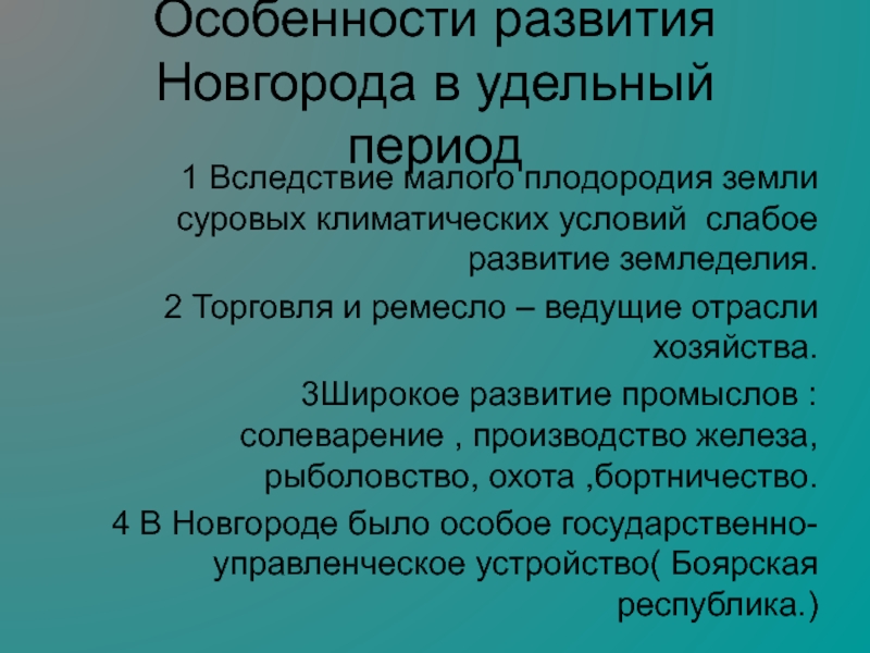 4 В Новгороде было особое государственно-управленческое устройство( Боярская республика.)