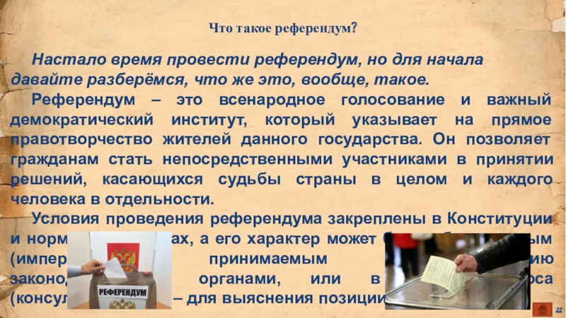 Слайд 22 Настало время провести референдум, но для начала давайте разберёмся, что же