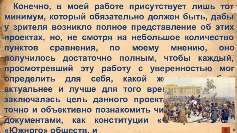 быть, дабы у зрителя возникло полное представление об этих проектах, но, не смотря на небольшое количество пунктов сравнения, по моему мнению, оно получилось достаточно полным, чтобы каждый, просмотревший эту работу с уверенностью мог определить для себя, какой же проект был актуальнее и лучше для того времени. В этом и заключалась цель данного проекта: максимально точно и объективно познакомить читателя с такими документами, как конституции «Северного» и «Южного» обществ, и