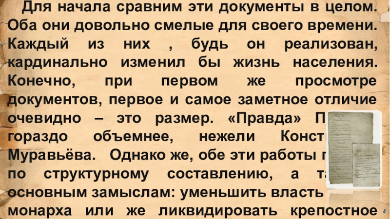 для своего времени. Каждый из них , будь он реализован, кардинально изменил бы жизнь населения. Конечно, при первом же просмотре документов, первое и самое заметное отличие очевидно – это размер. «Правда» Пестеля гораздо объемнее, нежели Конституция Муравьёва. Однако же, обе эти работы похожи по структурному составлению, а так же основным замыслам: уменьшить власть