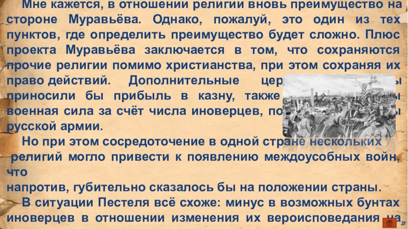 Слайд 19 Мне кажется, в отношении религии вновь преимущество на стороне Муравьёва. Однако,