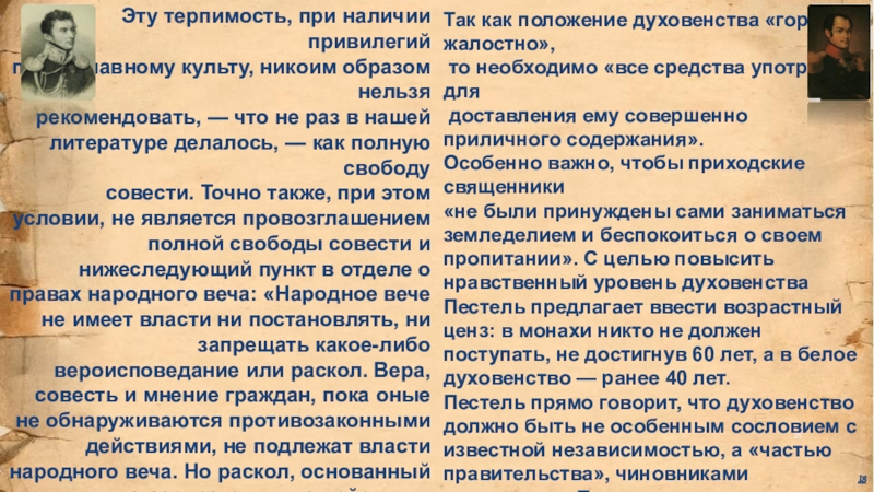 «не были принуждены сами заниматься земледелием и беспокоиться о своем пропитании». С целью повысить нравственный уровень духовенства Пестель предлагает ввести возрастный ценз: в монахи никто не должен поступать, не достигнув 60 лет, а в белое духовенство — ранее 40 лет.