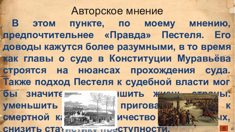 Его доводы кажутся более разумными, в то время как главы о суде в Конституции Муравьёва строятся на нюансах прохождения суда. Также подход Пестеля к судебной власти мог бы значительно улучшить жизнь страны: уменьшить число приговариваемых к смертной казни и количество заключенных, снизить статистику преступности.