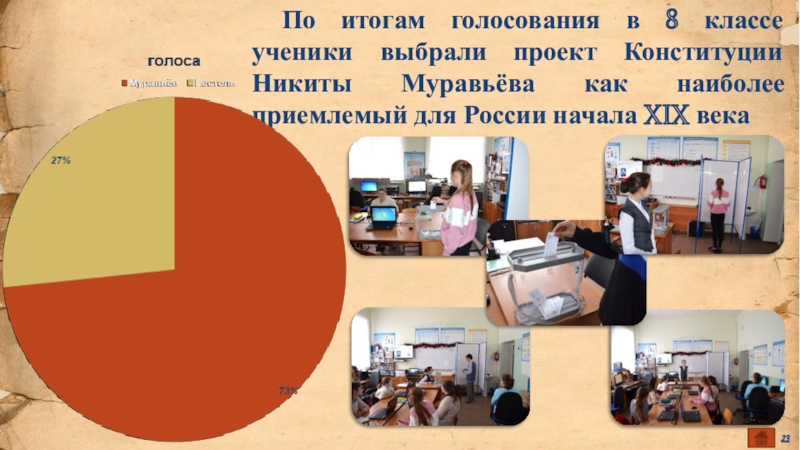 Слайд 23 По итогам голосования в 8 классе ученики выбрали проект Конституции Никиты