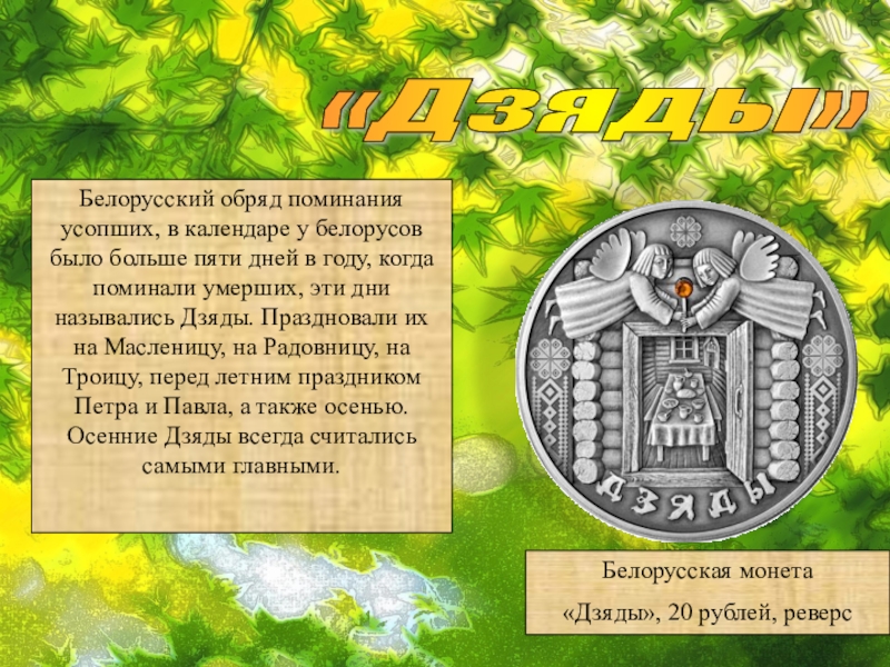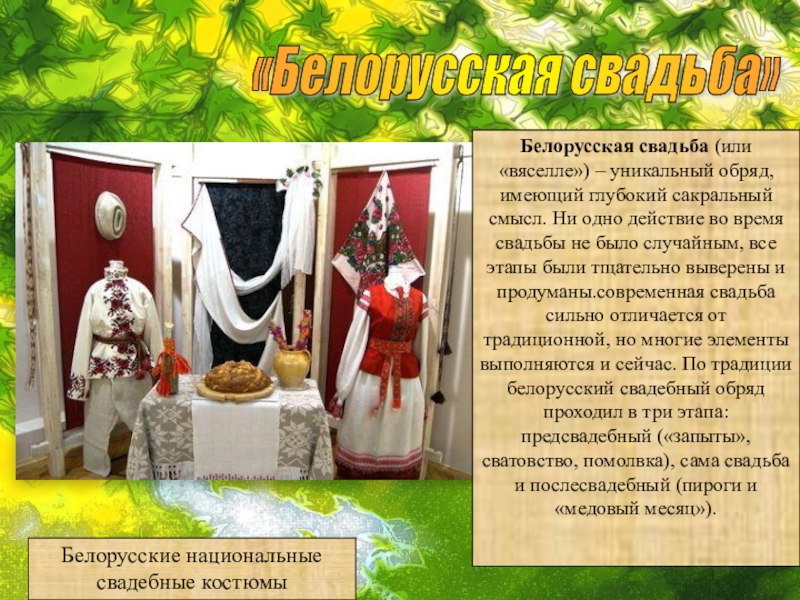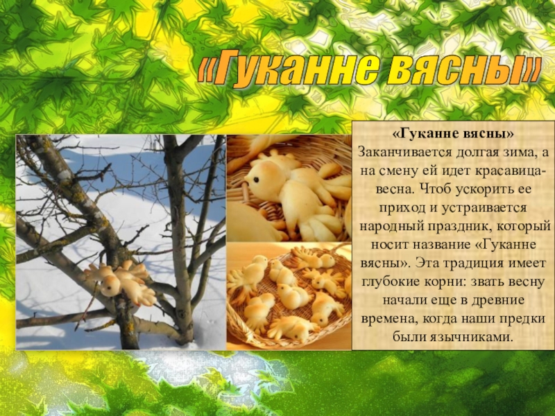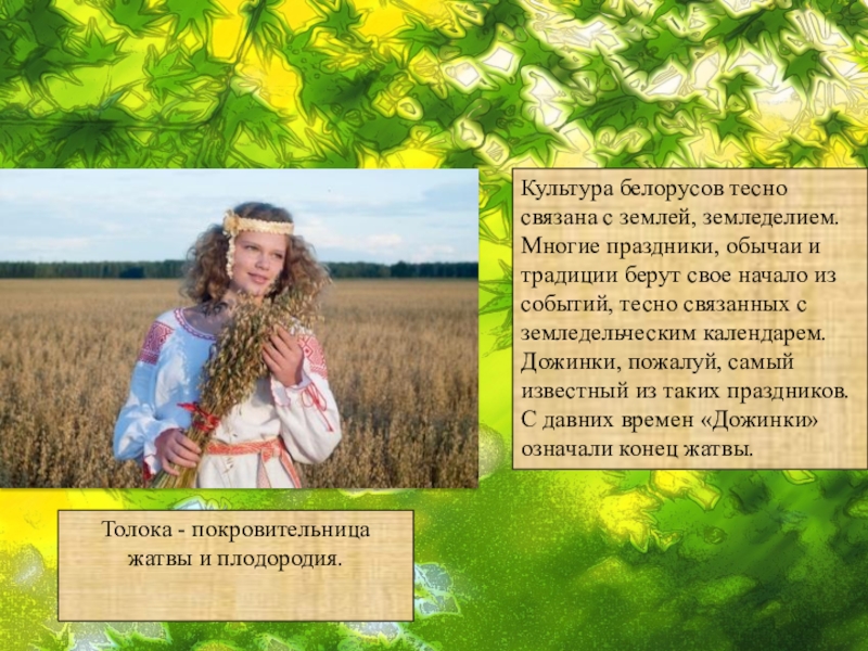 Купалы, "Громницы" и "Гуканне весны" (перелом года от зимы к лету), "Сороки" и "Деды", "Коляд" и "Дожинок" (праздник окончания жатвы) и заканчивая множеством свадебных обрядов.