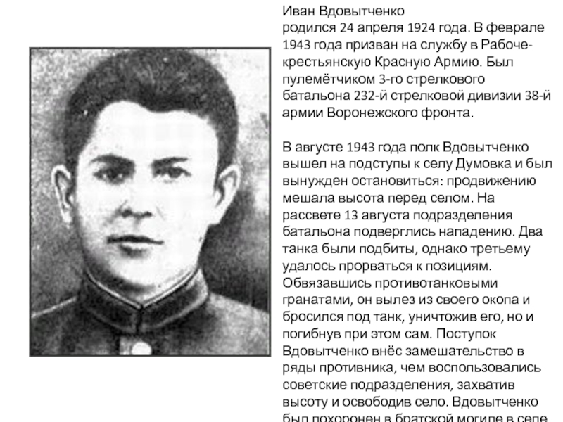 В августе 1943 года полк Вдовытченко вышел на подступы к селу Думовка и был вынужден остановиться: продвижению мешала высота перед селом. На рассвете 13 августа подразделения батальона подверглись нападению. Два танка были подбиты, однако третьему удалось прорваться к позициям. Обвязавшись противотанковыми гранатами, он вылез из своего окопа и бросился под танк, уничтожив его, но и погибнув при этом сам. Поступок Вдовытченко внёс замешательство в ряды противника, чем воспользовались советские подразделения, захватив высоту и освободив село. Вдовытченко был похоронен в братской могиле в селе Самотоевка того же района.