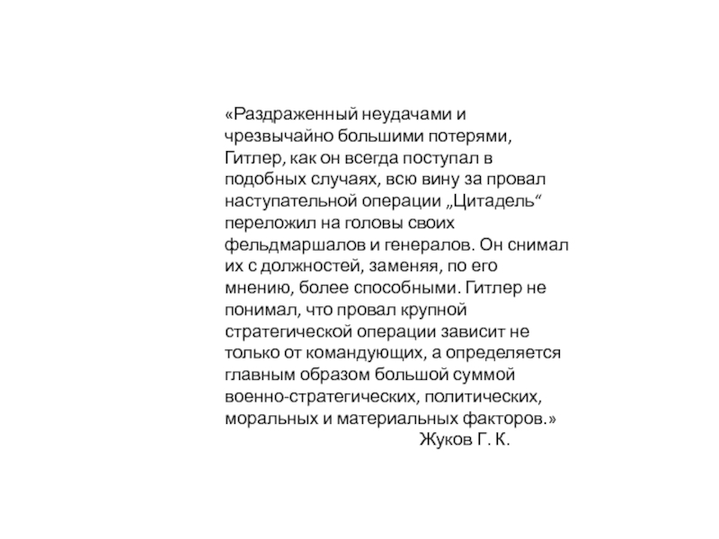 в подобных случаях, всю вину за провал наступательной операции „Цитадель“ переложил на головы своих фельдмаршалов и генералов. Он снимал их с должностей, заменяя, по его мнению, более способными. Гитлер не понимал, что провал крупной стратегической операции зависит не только от командующих, а определяется главным образом большой суммой военно-стратегических, политических, моральных и материальных факторов.»