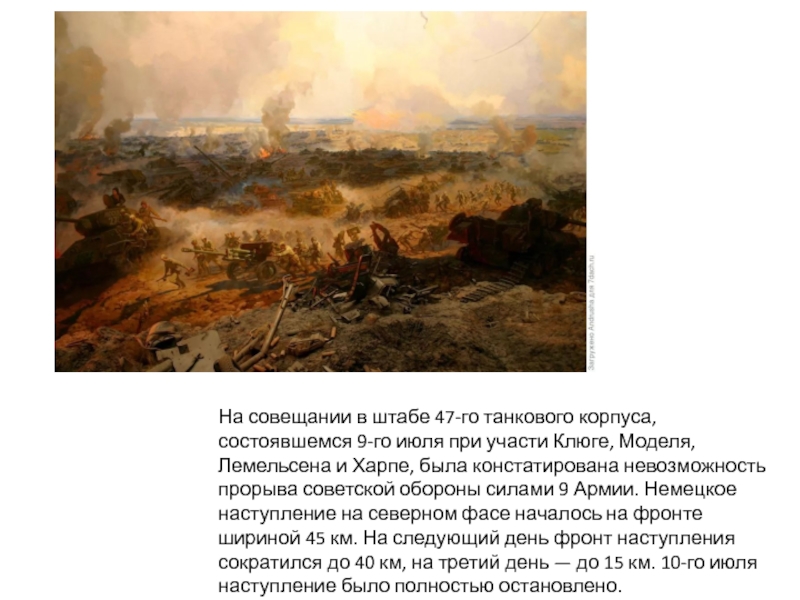 Слайд 13На совещании в штабе 47-го танкового корпуса, состоявшемся 9-го июля при