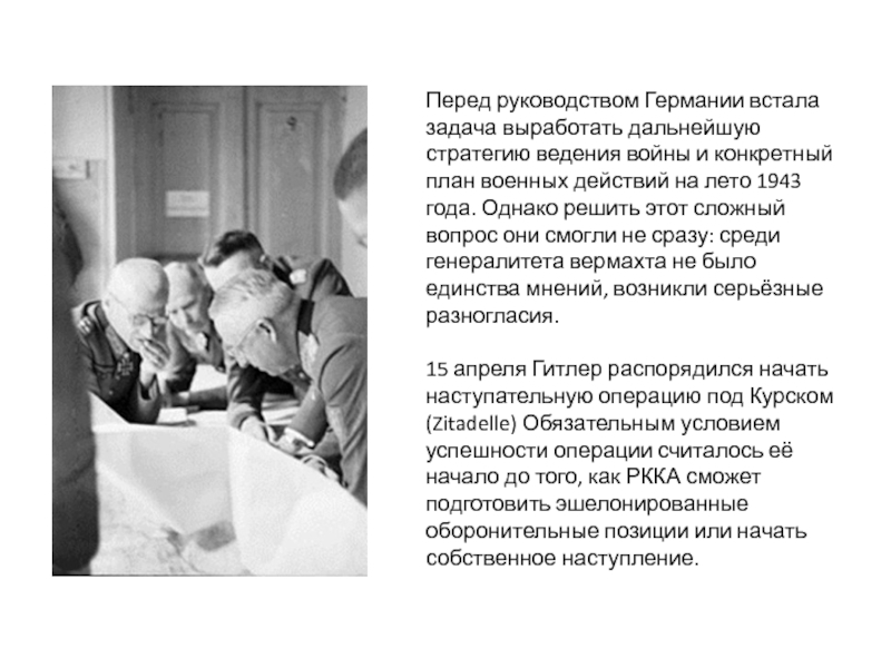 конкретный план военных действий на лето 1943 года. Однако решить этот сложный вопрос они смогли не сразу: среди генералитета вермахта не было единства мнений, возникли серьёзные разногласия.