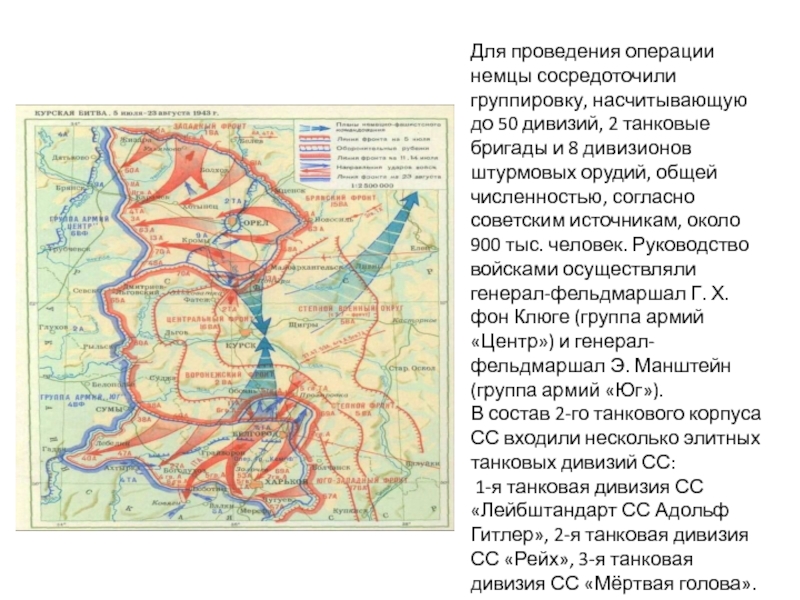 танковые бригады и 8 дивизионов штурмовых орудий, общей численностью, согласно советским источникам, около 900 тыс. человек. Руководство войсками осуществляли генерал-фельдмаршал Г. Х. фон Клюге (группа армий «Центр») и генерал-фельдмаршал Э. Манштейн (группа армий «Юг»).
